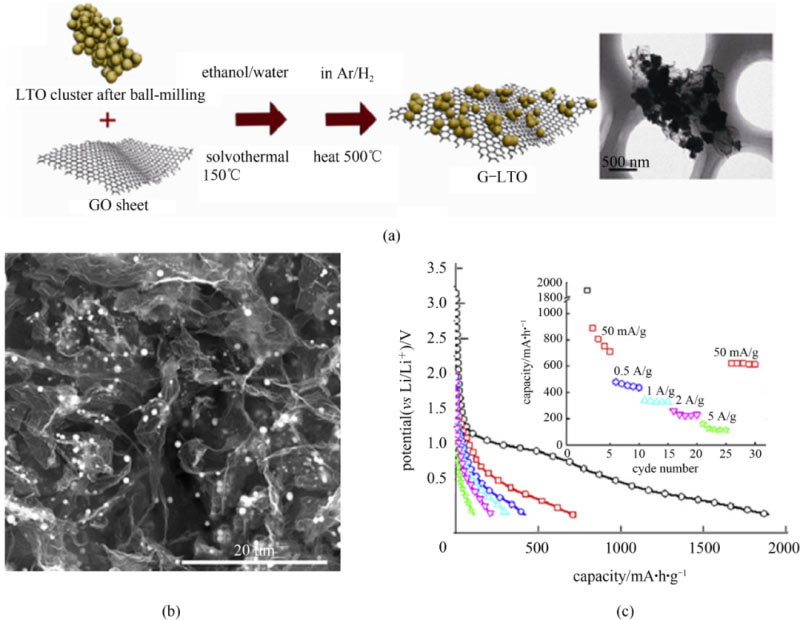 圖9 (a) G-LTO納米復(fù)合材料的合成原理圖及掃描電鏡照片;(b) SnO2-RGO的掃描電鏡照片;(c) SnO2-RGO的倍率性能