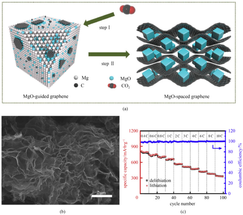圖7 (a) 自蔓延高溫合成石墨烯的制備原理示意圖;(b) SHSG的掃描電鏡照片;(c) SHSG負(fù)極的倍率性能