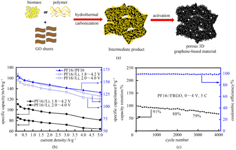 圖5 (a) 多孔三維石墨烯材料(PF16)的制備流程圖;(b) PF16正極材料的電化學(xué)性能;(c) 基于PF16正極的鋰離子電容器的循環(huán)壽命和庫侖效率