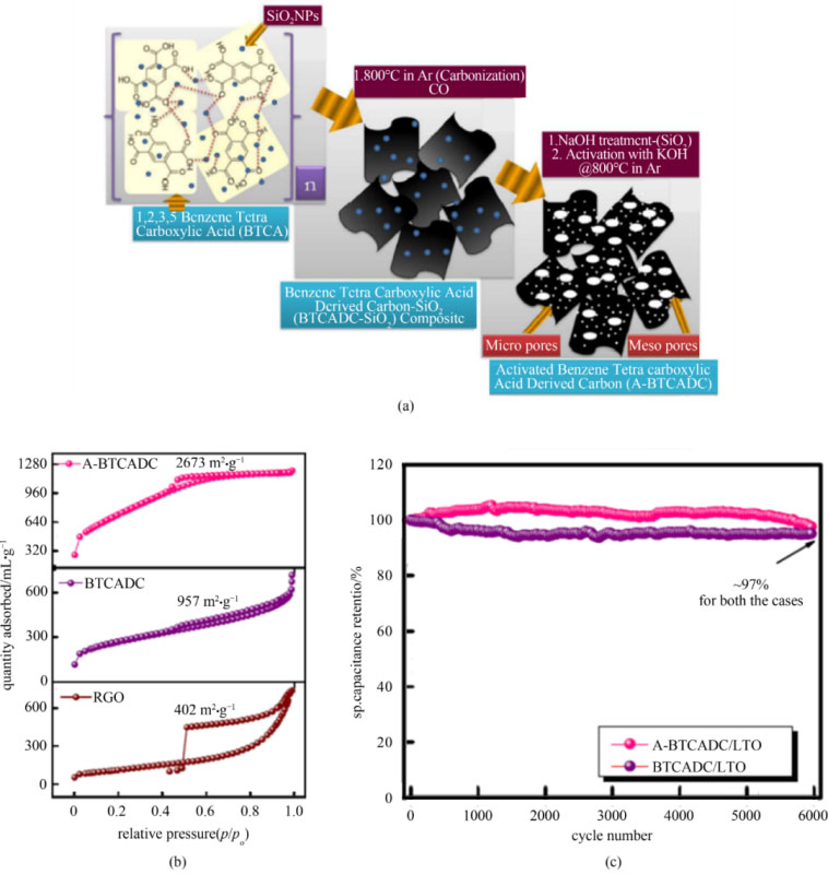 圖4 (a) BTCADC和A-BTCADC的制備示意圖;(b) A-BTCADC、BTCADC和RGO的低溫N2吸脫附曲線;(c) 基于BTCADC/LTO和A-BTCADC/LTO的鋰離子電容器的循環(huán)壽命