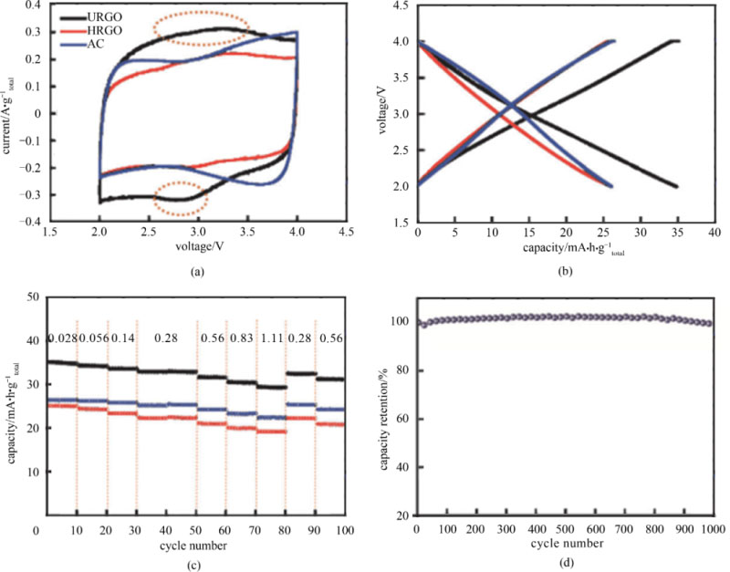 圖3 (a) 基于URGO、HRGO和AC的CV曲線,掃速為5 mV/s,電壓范圍為2~4 V;(b) 基于URGO、HRGO和AC的充放電曲線;(c) 倍率性能;(d) 基于URGO的鋰離子電容器在0.14 A/g的電流密度的循環(huán)壽命,電壓范圍為2.2~3.8 V