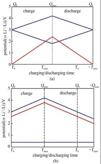 圖2 (a) 基于活性炭的雙電層超級(jí)電容器的充放電工作電壓曲線;(b) 鋰離子電容器的電壓充放電工作電壓曲線,其負(fù)極為石墨,正極為活性炭