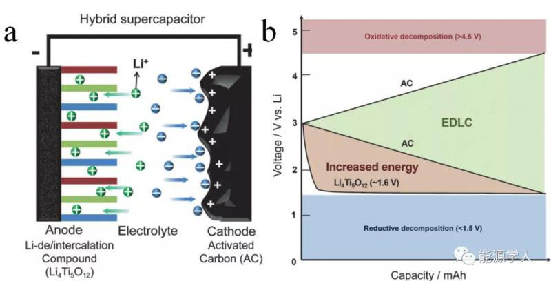 圖8. (a) 混合超級電容器電化學(xué)反應(yīng)機理。(b) 雙電層電容器和混合超級電容器中負極和正極典型的電化學(xué)曲線。相對于鋰金屬,電解液的氧化和還原分解分別發(fā)生在高于4.5 V和低于1.5 V的電壓下。