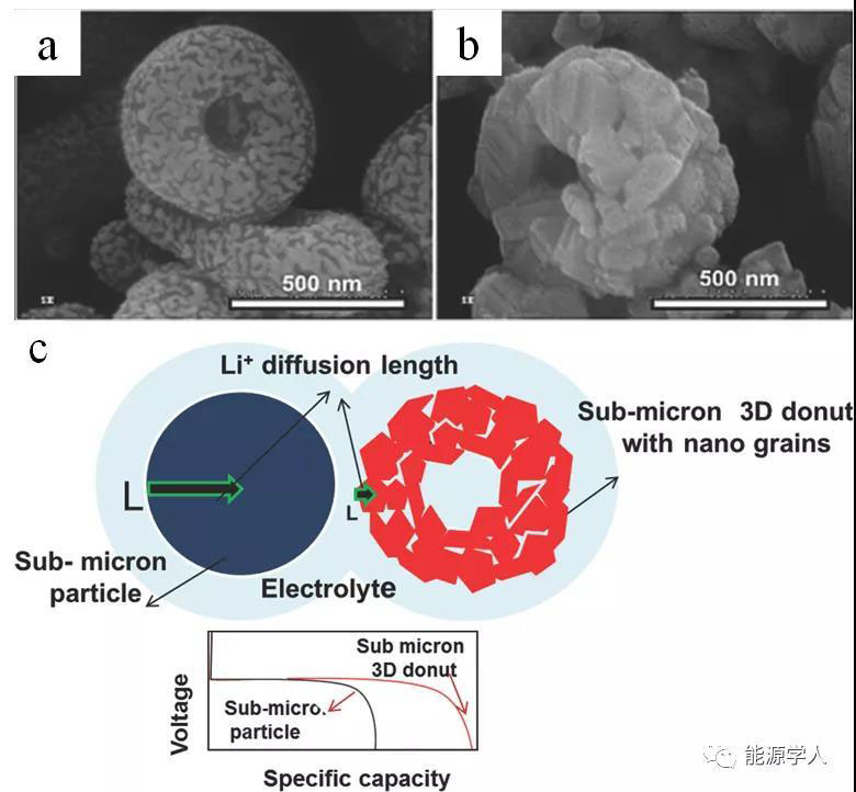 圖4. (a), (b) 甜甜圈形Li4Ti5O12SEM圖,(c) 鋰離子擴散動力增強示意圖。