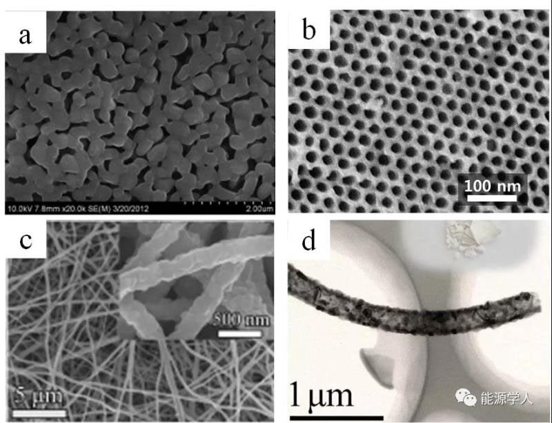 圖3. SEM圖:(a) Li4Ti5O12粉末,(b) 通過溶膠凝膠法制備的以SiO2為模板的有序介孔TiNb2O7,(c) Li4Ti5O12纖維,(d) 電紡絲制備的中空TiNb2O7納米纖維.