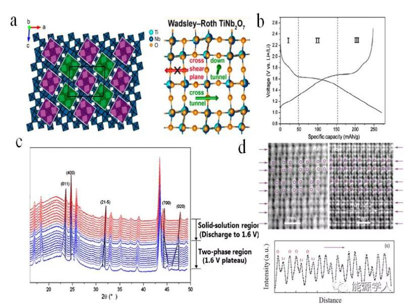 Goodenough于2011年率先研究了TiNb2O7作為鋰離子電池Ti-Nb-O(TNO)負極材料,理論容量是Li4Ti5O12的兩倍,為387.6 mAh g-1。TNO化合物屬于單斜切ReO3型晶體結(jié)構(gòu),其分層結(jié)構(gòu)沿[010]晶帶軸分布,如圖2a所示。如圖2d所示,Chen等使用環(huán)形明亮場(ABF)掃描透射電子顯微鏡(STEM)研究了TiNb2O7中鋰離子的嵌入和脫嵌機理。鋰離子沿著[010]晶帶軸的1D通道被存儲在(001)平面上。當四個Li+嵌入TiNb2O7中形成Li4TiNb2O7時,晶胞體積將擴大9.2%。ReO3的剪切結(jié)構(gòu)在鋰離子的嵌入/脫出過程中可以基本保持不變,因此具有出色的結(jié)構(gòu)穩(wěn)定性。