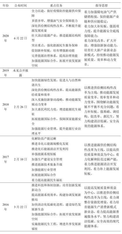 《意見》延續(xù)了“四個革命、一個合作”能源安全戰(zhàn)略思想和《能源發(fā)展“十三五“規(guī)劃》的基本要求,圍繞創(chuàng)新、協(xié)調(diào)、綠色、開放、共享理念做文章。和2016~2018年連續(xù)將推進(jìn)能源供給側(cè)結(jié)構(gòu)性改革作為指導(dǎo)思想內(nèi)容不同,2020年《意見》的指導(dǎo)思想明確要保持能源產(chǎn)業(yè)鏈和供應(yīng)鏈穩(wěn)定,突出能源安全底線保障(表1)。