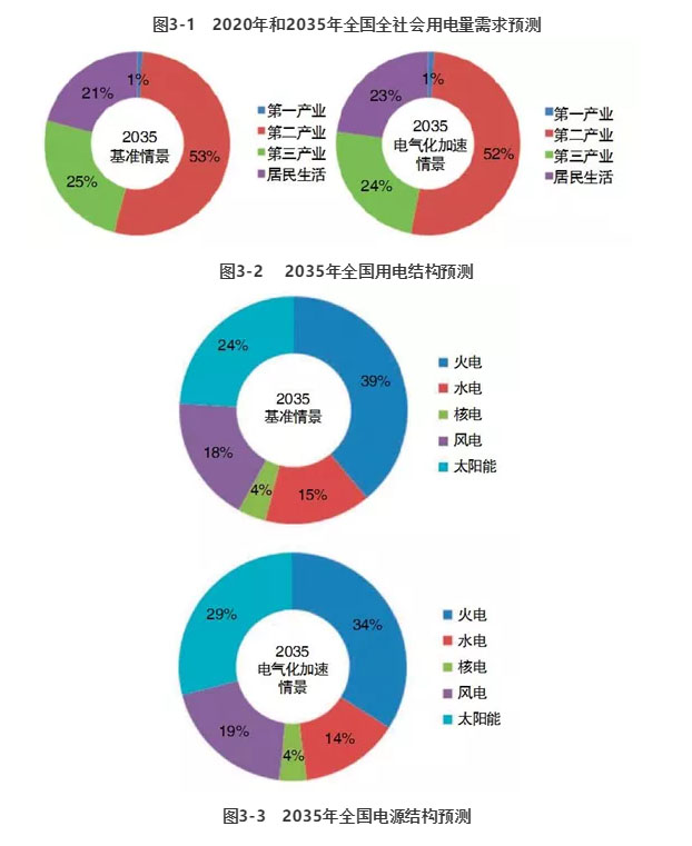黨的十九大報(bào)告明確提出,2035年要基本實(shí)現(xiàn)社會(huì)主義現(xiàn)代化,2050年要建成富強(qiáng)民主文明和諧美麗的社會(huì)主義現(xiàn)代化強(qiáng)國(guó)。據(jù)有關(guān)機(jī)構(gòu)預(yù)測(cè),2035年我國(guó)GDP將達(dá)到32萬億美元,年均增速仍將保持4%~5%,城鎮(zhèn)化率將由現(xiàn)在的近60%提升到70%~75%。綜合考慮需求增長(zhǎng)、能效提升等因素,預(yù)計(jì)2020~2035年我國(guó)用電量年均增速在2.7%~3.3%之間,到2035年,我國(guó)全社會(huì)用電量將達(dá)到11.4~12.4萬億千瓦時(shí),人均用電量、人均生活用電量分別達(dá)到8000、1900千瓦時(shí),發(fā)電能源占比有望達(dá)到57%,終端用電占比達(dá)到38%,與發(fā)達(dá)國(guó)家的電氣化水平差距將顯著縮小。