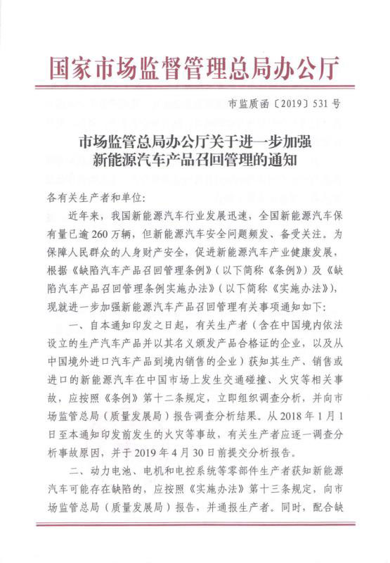 近年來,我國新能源汽車行業(yè)發(fā)展迅速,但新能源汽車安全問題頻發(fā)、備受關(guān)注。為保障人民群眾的人身財產(chǎn)安全,促進新能汽車產(chǎn)業(yè)健康發(fā)展。國家市場監(jiān)督管理總局于2019年3月15日正式對外發(fā)布了《關(guān)于進一步加強新能源汽車產(chǎn)品召回管理的通知》。