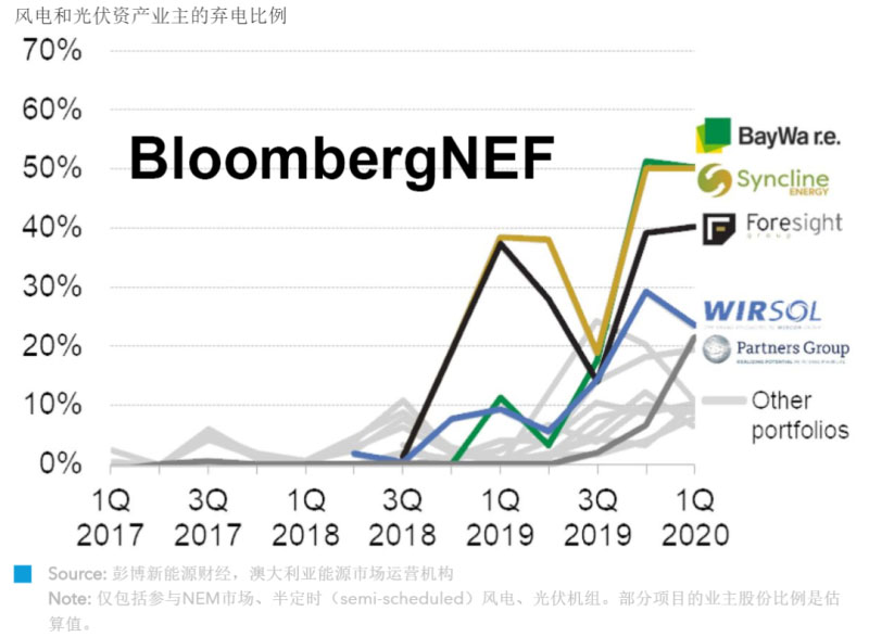 2020年第一季度維多利亞州風(fēng)電電價(jià)比實(shí)時(shí)全天候平均批發(fā)電價(jià)低36%,同比降幅28%。同期NEM棄風(fēng)率從1%增至6%。