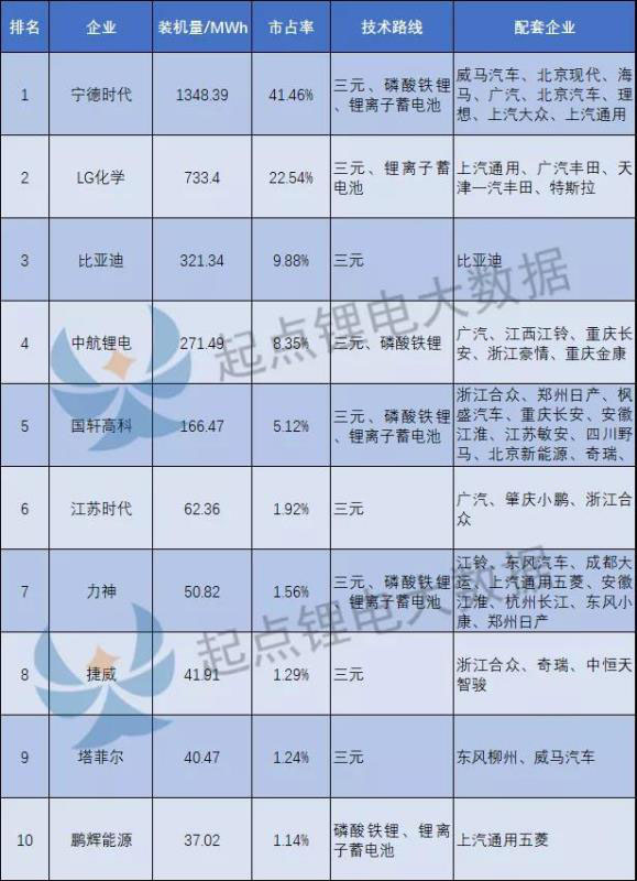 6月新能源乘用車(chē)動(dòng)力電池裝機(jī)量TOP 10 企業(yè)分別是:寧德時(shí)代、LG化學(xué)、比亞迪、中航鋰電、國(guó)軒高科、江蘇時(shí)代、力神、捷威、塔菲爾、鵬輝能源。