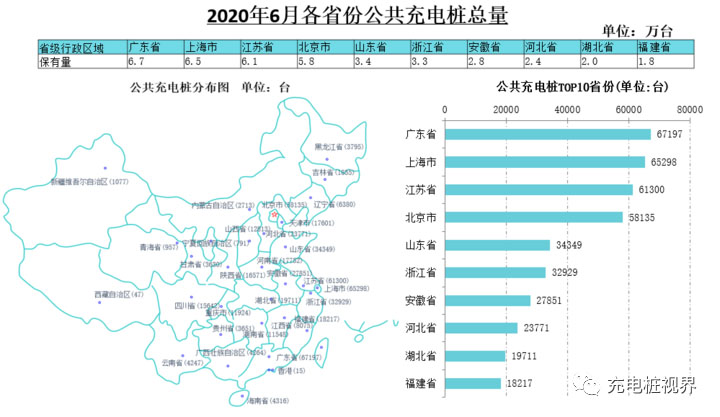 廣東、上海、江蘇、北京、山東、浙江、安徽、河北、湖北、福建TOP10地區(qū)建設(shè)的公共充電基礎(chǔ)設(shè)施占比達(dá)73.2%。