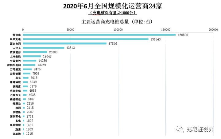 截止到2020年6月,全國充電運(yùn)營企業(yè)所運(yùn)營充電樁數(shù)量超過1萬臺(tái)的共有8家,分別為:特來電運(yùn)營16.1萬臺(tái)、星星充電運(yùn)營13.2萬臺(tái)、國家電網(wǎng)運(yùn)營8.8萬臺(tái)、云快充運(yùn)營4.4萬臺(tái)、依威能源運(yùn)營2.5萬臺(tái)、上汽安悅運(yùn)營1.9萬臺(tái)、中國普天運(yùn)營1.4萬臺(tái)、深圳車電網(wǎng)運(yùn)營1.3萬臺(tái)。這8家運(yùn)營商占總量的88.8%,其余的運(yùn)營商占總量的11.2%。