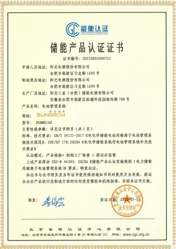 中國儲能網(wǎng)訊:7月10日,北京鑒衡認證中心(以下稱“CGC鑒衡”)向陽光電源股份有限公司(以下稱“陽光電源”)頒發(fā)了國內(nèi)首張電化學儲能電站用電池管理系統(tǒng)(BMS)認證證書,依據(jù)標準為GB/T 34131-2017《電化學儲能電站用鋰離子電池管理系統(tǒng)技術規(guī)范》、CGC/GF 176:2020A《電化學儲能系統(tǒng)用電池管理系統(tǒng)補充技術要求》。