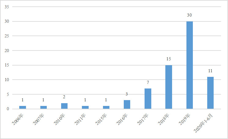 圖2 中國(guó)2006年-2020年1-6月建成加氫站情況