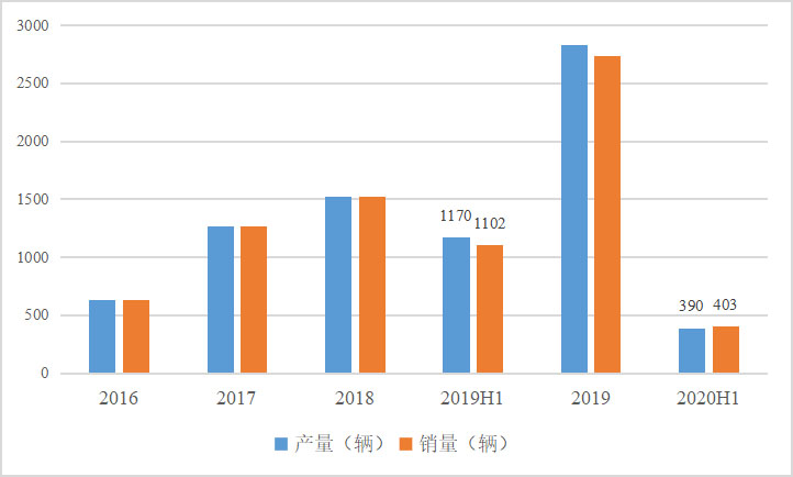 圖1 中國(guó)2016-2020H1燃料電池汽車產(chǎn)銷量