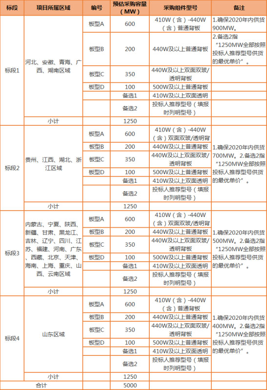 2.2標(biāo)段劃分:本次光伏組件招標(biāo)擬劃分為4個(gè)標(biāo)段,采購電壓等級為1500V光伏組件,預(yù)估采購總?cè)萘?000MW,其中基本容量4000MW,儲(chǔ)備容量1000MW。