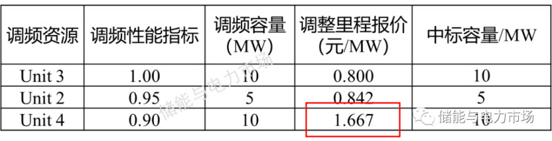 上圖中,unit2、unit3、unit4中標(biāo),根據(jù)這幾個(gè)中標(biāo)機(jī)組的調(diào)整里程報(bào)價(jià)從低到高進(jìn)行排序,最高的調(diào)整里程報(bào)價(jià)為市場(chǎng)里程出清價(jià)格。
