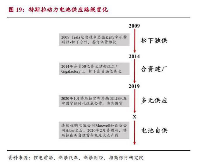 二線企業(yè)仍蘊(yùn)藏生機(jī),未來有望形成一超多強(qiáng)的格局。作為新能源汽車行 業(yè)的領(lǐng)軍企業(yè),特斯拉對動力電池供應(yīng)商的選擇經(jīng)歷四個(gè)階段:(1)松下獨(dú) 供:發(fā)展初期,特斯拉從技術(shù)與品質(zhì)優(yōu)先的角度出發(fā),選擇松下作為其唯一的 供應(yīng)商;(2)合資建廠:發(fā)展中期,特斯拉動力電池需求旺盛,與松下合資 建立超級工廠,形成深度綁定關(guān)系;(3)多元供應(yīng):產(chǎn)能爬坡期,與松下關(guān) 于產(chǎn)能擴(kuò)建與電池成本等方面矛盾凸顯,特斯拉從成本、品質(zhì)、規(guī)模優(yōu)先的角 度引入 LG 和寧德時(shí)代;(4)電池自供:隨著 2019 年先后收購電池公司 Maxwell 和電池設(shè)備公司 Hibar,2020 年 2 月自建電池試點(diǎn)產(chǎn)線,未來特斯拉 電池自供的規(guī)劃逐漸清晰。其他新能源汽車企業(yè)對動力電池供應(yīng)商的選擇,大 概率也會經(jīng)歷上述四個(gè)階段,屆時(shí)對動力電池的格局有著較大的影響。