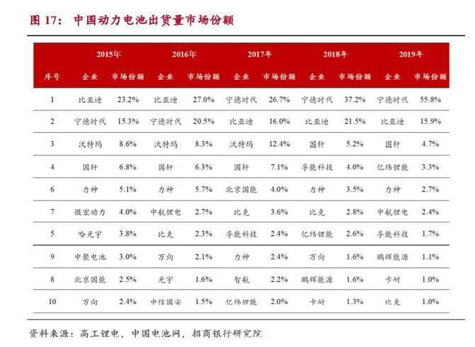 集中度逐年提升,龍頭企業(yè)優(yōu)勢顯著。2018 年、2019 年 CR10 市場份額分 別為 81.3%、89.7%,行業(yè)集中度持續(xù)提升。2019 年寧德時(shí)代市場份額高達(dá) 55.8%,占比首次過半,同比增速達(dá) 50.1%, 增幅顯著;比亞迪市場份額為 15.9%,同比下滑 26.1%。與此同時(shí),二線企業(yè)生存空間明顯壓縮,2018 年底 國內(nèi)動力電池企業(yè)還剩 90 多家,而 2020 年有電池裝機(jī)的動力電池企業(yè)只剩 38 家,行業(yè)洗牌加劇。2019 年 TOP10 企業(yè)中,除了寧德時(shí)代,只有億緯鋰能 和中航鋰電兩家市場份額呈正增長,剩下的 7 家企業(yè)均出現(xiàn)不同程度的下滑, 除了國軒下滑 9.2%,其余 6 家降幅均在 20%以上,降幅顯著。
