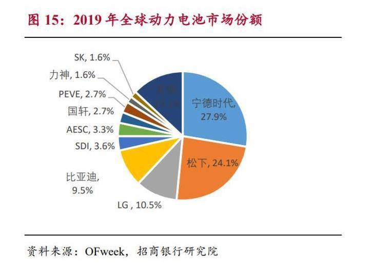 日韓企業(yè)發(fā)力,占比顯著提升。2018 年和 2019 年 CR10 分別為 81.2%、 88.9%,行業(yè)集中度持續(xù)提升,行業(yè)競爭趨于激烈。從主要國家來看,TOP10 全部來自中日韓三國。2019 年 TOP10 市場占比中,中日韓占比分別 41.8%、 31.4%、17.3%,中國市場份額呈下滑趨勢,日韓呈上升趨勢。主要是由于中 國電池企業(yè)對國內(nèi)市場依賴度較高,海外市場表現(xiàn)較佳的寧德時(shí)代, 2019 年 的電池出口額僅占營收的 5.6%。近兩年隨著歐美新能源汽車市場的快速增長, 與其深度綁定的日韓企業(yè)得到了迅速發(fā)展。從動力電池企業(yè)來看,2019 年頭 部企業(yè)寧德時(shí)代及松下競爭優(yōu)勢明顯,合計(jì)占比達(dá) 52%。但 LG 增長較快,位列第三,同比增速達(dá) 39.7%。國內(nèi)企業(yè)除寧德時(shí)代之外,整體下滑明顯,其中 比亞迪跌出前三,市占率同比下滑 27.9%,降幅顯著。