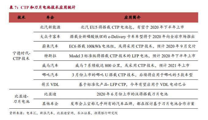 助力龍頭企業(yè)筑造技術(shù)壁壘,鞏固行業(yè)定位,拓展海外市場。寧德時(shí)代 CTP 技術(shù)知識產(chǎn)權(quán)超過 200 項(xiàng),比亞迪刀片電池技術(shù)核心專利超過 300 項(xiàng),兩 者均為龍頭企業(yè)筑造了較高的技術(shù)壁壘。寧德時(shí)代 CTP 技術(shù)有“無模組”和“大 模組” 兩種方案,其中“大模組”方案對車型的適配度較高。據(jù)不完全統(tǒng)計(jì),國 內(nèi)下半年有 5 款搭載 CTP 技術(shù)的車型上市,其中不乏明星車型 Model3 和蔚來 EC6 等,屆時(shí)有助于寧德時(shí)代進(jìn)一步提高國內(nèi)市場占有率。同時(shí)基于 CTP 技 術(shù)的磷酸鐵鋰電池在大眾卡客車型和荷蘭 VDL 車型上的應(yīng)用,將有助于寧德 時(shí)代拓展海外市場。而比亞迪刀片電池技術(shù)有助于發(fā)揮其磷酸鐵鋰龍頭企業(yè)的 優(yōu)勢,助力其挖掘新的國內(nèi)外動力電池客戶。