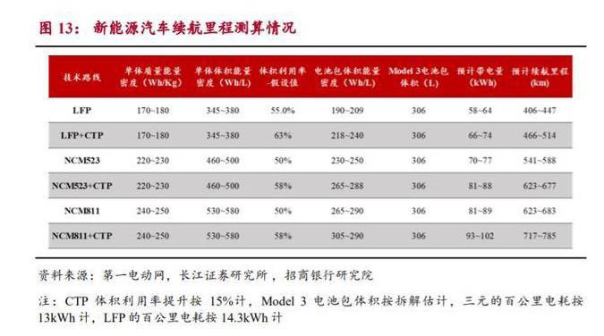 助力磷酸鐵鋰回暖,提升新能源汽車產(chǎn)品力。為了衡量 CTP 技術(shù)(刀片技 術(shù))對新能源汽車行業(yè)的影響,我們以 Model 3 為樣車,測算了不同技術(shù)路線 搭配 CTP 技術(shù)之后車輛的續(xù)航里程。測試結(jié)果顯示:(1)CTP 技術(shù)可以將磷 酸鐵鋰電池包的能量密度提升至傳統(tǒng)中鎳電池包水平,有利于彌補(bǔ)磷酸鐵鋰能 量密度較低的缺陷,拓展其在低續(xù)航乘用車領(lǐng)域的應(yīng)用空間。但 CTP 技術(shù)本 質(zhì)上是結(jié)構(gòu)創(chuàng)新,不改材料端本身的劣勢,預(yù)期中長期乘用車領(lǐng)域仍以三元為主;(2)CTP 技術(shù)有望在現(xiàn)有基礎(chǔ)上,提升新能源汽車的續(xù)航里程。采用 NCM811-CTP 技術(shù)的新能源汽車?yán)m(xù)航里程可以達(dá)到 785km,有望徹底解決里 程焦慮,進(jìn)而提升產(chǎn)品力,助力新能源汽車滲透率的提升。此外,目前在電池 技術(shù)領(lǐng)域,國內(nèi)新能源汽車與特斯拉的主要差距在系統(tǒng)集成方面,CTP 和刀片 技術(shù)有助于縮短兩者的差距,利好國內(nèi)新能源汽車的發(fā)展。