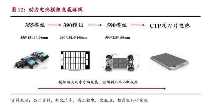 模組技術(shù)往大尺寸方向發(fā)展。新能源汽車初期階段,大部分底盤是油改電 平臺,其裝載的電池空間各不相同,導(dǎo)致對模組和電芯尺寸需求各不相同,而 電芯尺寸種類較多的劣勢顯著。隨著德國汽車工業(yè)協(xié)會推出電池 VDA 標(biāo)準(zhǔn)尺 寸,大眾推出 VDA 標(biāo)準(zhǔn) 355 模組,模組集成走向標(biāo)準(zhǔn)化的道路。隨著新能源 汽車發(fā)展的深入,各車企陸續(xù)推出基于電動化的整車平臺,裝載電池的底盤空 間有所增大和形狀更加規(guī)整,模組集成往大尺寸和高容量方向發(fā)展,空間利用 率和成組效率不斷提高。伴隨著電池模組越來越大的趨勢,寧德時(shí)代和比亞迪 分別推出了 CTP、刀片電池技術(shù)。