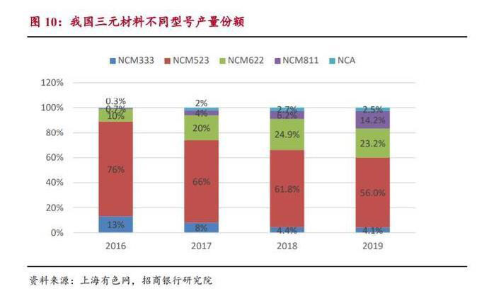 未來高鎳三元仍是主流。雖然磷酸鐵鋰占比有所回暖,但 2020 年工信部第 一批乘用車推薦目錄中仍有 82%的車型搭配三元電池,在乘用車領(lǐng)域三元仍占 主導(dǎo)地位。從三元產(chǎn)品結(jié)構(gòu)來看,高鎳化趨勢顯著。當(dāng)前國內(nèi)三元市場以中鎳 三元為主,其中市場份額最大的 NCM523 呈現(xiàn)下滑的趨勢。而低鎳三元由于 能量密度較低,成本優(yōu)勢下降,市場份額逐年被壓縮。相反,高鎳 NCM811 占比持續(xù)增加,2019 年市場份額同比增速達(dá) 129%,增幅顯著。NCM622 由于 與 NCM523 差異較小,部分企業(yè)會越過 NCM622,直接升級至 NCM811,預(yù) 計(jì)其占比有望維持在 23%左右。對于 NCA,由于國內(nèi)企業(yè)一直無法突破其較 高的技術(shù)壁壘,在國內(nèi)市場的份額占比較低。但隨著外資動力電池企業(yè)的進(jìn)入 和 Model 3 產(chǎn)能的釋放,其占比有望進(jìn)一步提升。
