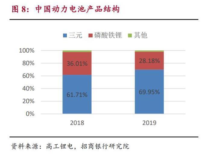 動力電池領(lǐng)域產(chǎn)品結(jié)構(gòu):三元為主、磷酸鐵鋰為輔。新能源汽車產(chǎn)品結(jié)構(gòu) 中乘用車占主導(dǎo)地位,2019 年乘用車、客車、專用車的占比分別為 88.06%、 7.88%、4.06%,乘用車市占率相較 2018 年提升了 4.22 pct,呈上升趨勢。受益 于下游新能源汽車產(chǎn)品結(jié)構(gòu),在政策補(bǔ)貼助力之下,動力電池領(lǐng)域形成了三元 為主,磷酸鐵鋰為輔的產(chǎn)品結(jié)構(gòu)。2019 年三元和磷酸鐵鋰的占比分別為 69.96%、28.18%,磷酸鐵鋰的占比不足三分之一。