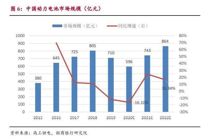 市場規(guī)模短期波動,未來仍有一定的增量空間。2019 年受限于新能源汽 車市場疲軟,動力電池市場規(guī)模有所收縮,總市場規(guī)模為 710 億元,同比下滑 11.80%。從新能源汽車銷量、單車帶電量和動力電池售價(jià)三個(gè)維度出發(fā),預(yù)計(jì) 2020 年動力電池市場規(guī)模約為 596 億元,同比增長率為-16.10%。后續(xù)隨著新 能源汽車市場的回暖,預(yù)計(jì) 2022 年市場規(guī)模有望達(dá)到 860 億元,未來 2 年復(fù) 合增長率約為 20%,仍有一定的增量空間。