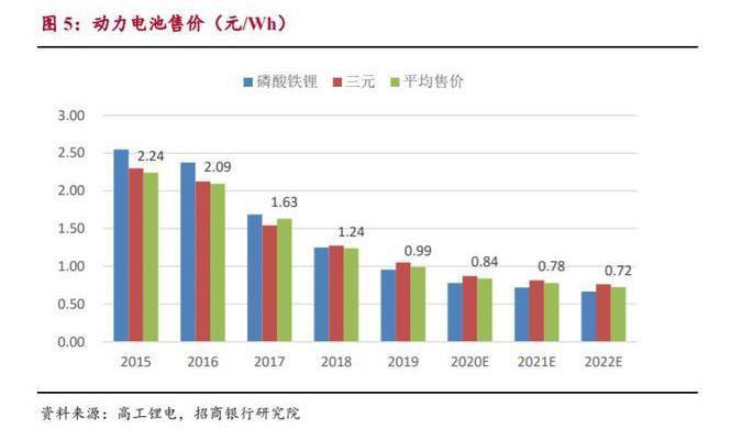 在下游整車平價(jià)訴求、上游原材料成本下降和自身制造成本下降三個(gè)維度 助力之下,動力電池售價(jià)呈現(xiàn)逐年明顯下降走勢。2019 年動力電池平均售價(jià) 為 0.99 元/Wh,同比下降 19.93%,降幅有所收窄。預(yù)計(jì) 2020 年三元、磷酸鐵 鋰電池的售價(jià)分別為 0.87、0.78 元/Wh,粗略預(yù)估動力電池平均售價(jià)為 0.84 元 /Wh 左右,同比下降 15.25%??紤]到上游原材料成本下降速率有限,預(yù)計(jì) 2022 年三元、磷酸鐵鋰電池的售價(jià)分別為 0.76、0.66 元/Wh,粗略預(yù)估動力電 池平均售價(jià)約為 0.72 元/Wh,未來 2 年的年復(fù)合增長率為-9.93%。屆時(shí),新能 源汽車與傳統(tǒng)燃油車購車成本進(jìn)一步縮小,有望于 2025 年實(shí)現(xiàn)基本平價(jià)。