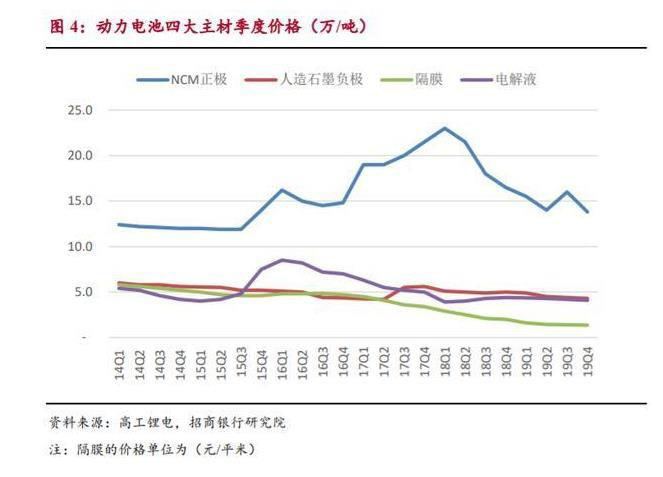 上游供給側(cè):原材料成本逐年下降,利好動力電池成本控制。動力電池上 游原材料中最重要的是四大主材:正極材料、負(fù)極材料、隔膜、電解液。隨著 中國新能源汽車市場的崛起,國內(nèi)形成了完整的動力電池原材料產(chǎn)業(yè)集群,其 中四大主材的國產(chǎn)化率均在 90%以上。經(jīng)過前期供需關(guān)系轉(zhuǎn)變和鋰鈷資源價(jià)格 波動,受益于規(guī)?;?yīng)、自動化率提高和競爭格局的加劇,四大主材的價(jià)格 呈現(xiàn)逐年下降的態(tài)勢。相較 2018 年 Q1,2019 年 Q4 正極、負(fù)極和隔膜的價(jià)格 分別下降 40.0%、15.7%、53.4%,降幅顯著。而電解液價(jià)格維持在 4 萬/噸左 右,整體上略有下降。上游供給側(cè)原材料成本的下降,利好動力電池成本控制。