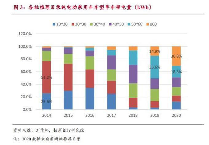 續(xù)航里程需求驅(qū)使,單車帶電量顯著提升。新能源汽車的動力來源是車載 動力電池系統(tǒng),車輛的續(xù)航里程主要由電池系統(tǒng)帶電量和百公里電耗決定。目 前提升車輛續(xù)航能力最直接的策略就是增加整車帶電量,如優(yōu)化車身結(jié)構(gòu)以增 加電池?cái)?shù)量或選配能量密度更高的動力電池。工信部公布的各批次純電動乘用 車性能參數(shù)顯示,2014 年以來單車帶電量顯著提升。2014 年大部分車型帶電 量在 20~30kWh 區(qū)間,占比為 51.2%。2019 年大部分車型帶電量在≥50kWh 區(qū) 間,接近 2014 年的兩倍。而 2020 年公示的車型中,單車帶電量≥60kWh 的車 型占比達(dá) 30.8%,相較 2019 年上升了 15.9 個(gè)百分點(diǎn),增速顯著。受益于續(xù)航 里程的持續(xù)提升,新能源汽車單車電量持續(xù)提升的趨勢短期不會改變。預(yù)計(jì) 2021 年推出的純電動乘用車中帶電量≥60kWh 車型占比有望達(dá)到 50%左右,有 利于帶動動力電池的需求。