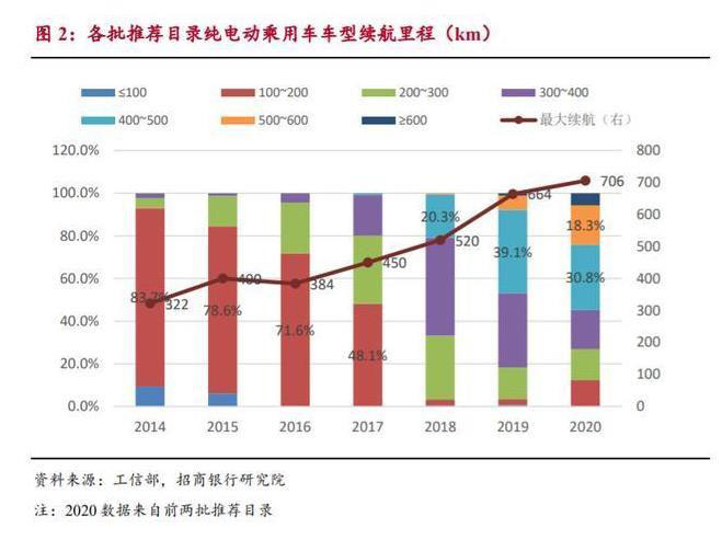 技術(shù)與政策雙驅(qū)動,續(xù)航里程顯著提升。續(xù)航里程一直以來是新能源汽車 的行業(yè)痛點(diǎn)之一,也是消費(fèi)者對新能源汽車望而卻步的主要因素之一。近年來, 隨著動力電池技術(shù)的進(jìn)步,輔以補(bǔ)貼政策的積極引導(dǎo),新能源汽車的續(xù)航里程 顯著提升。迄今為止,工信部共公布三十一批《免征購置稅的純電動乘用車車 型目錄》, 2014 年大部分車型續(xù)航里程在 100~200km,占比高達(dá) 83.7%。 2014 年以來續(xù)航里程逐年提升,最大續(xù)航里程已由 322km 提高至 706km,增 速顯著。最近三年續(xù)航里程以每年接近 100km 的速度顯著提升,2019 年公示 的大部分車型續(xù)航在 300~500km 區(qū)間,其中 400km 以上續(xù)航里程的車型占比 為 46.9% 。而 2020 年公示的兩批目錄中,大部分車型的續(xù)航里程在 400~600km,其中 400km 以上續(xù)航里程的占比為 54.8%,相較 2019 年提高了 7.9 個(gè)百分點(diǎn)。在最新公布的補(bǔ)貼方案中,已將純電動乘用車?yán)m(xù)航里程補(bǔ)貼門 檻提高至 300km。伴隨著消費(fèi)升級和行業(yè)競爭加劇趨勢,預(yù)計(jì)后續(xù)除特定應(yīng)用 場景之外,低續(xù)航里程的車型逐漸會被淘汰,高續(xù)航里程的車型占比會逐年提 升。預(yù)計(jì) 2021 年推出的純電動乘用車中續(xù)航里程在 400km 以上的車型占比可 以達(dá)到 80%左右,最大續(xù)航里程有望達(dá)到 800km 左右。