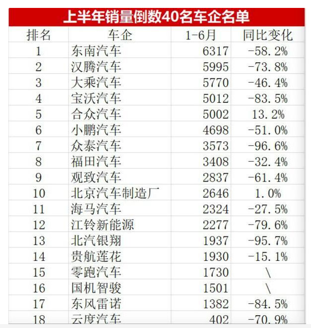 還有不少上榜的車企是新能源車企,比如江鈴新能源、云度汽車、愛馳汽車、新特汽車、知豆汽車、康迪汽車、電咖汽車等,其中,知豆汽車、康迪汽車、電咖汽車上半年銷量為零,幾乎已經(jīng)處于停產(chǎn)的階段。