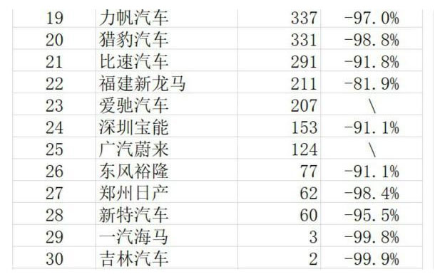 值得注意的是,銷量倒數(shù)40名的車企,目前統(tǒng)計(jì)數(shù)據(jù)仍為企業(yè)旗下乘用車銷量,例如福田汽車、江西五十鈴、鄭州日產(chǎn)等企業(yè)的商用車車型銷量并未統(tǒng)計(jì)在內(nèi),不過,從另一個角度而言,這也意味著上述車企“商轉(zhuǎn)乘”的戰(zhàn)略并未成功。