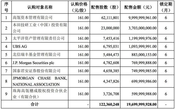 7月17日晚間,寧德時代發(fā)布公告,公布非公開發(fā)行股票發(fā)行結(jié)果,此次募集資金總額197億元。其中高瓴資本認(rèn)購100億元,本田認(rèn)購37億元,具體如下圖: