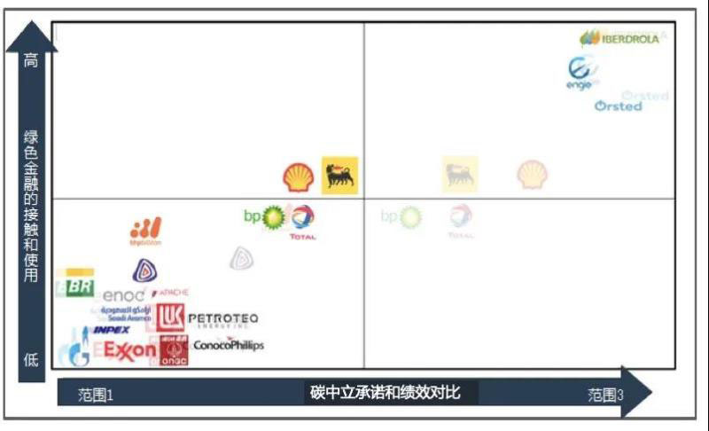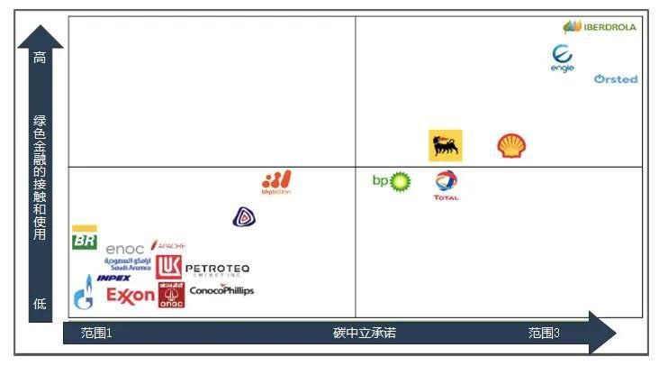 研究表明,世界上體量最大、影響力最強的前20家化石燃料公司占據(jù)了全球30%以上的化石能源消費量[2],產(chǎn)生了當(dāng)代溫室氣體三分之一的排放量[3]。CDP的研究卻指出,自2017年以來,全球最具影響力的24家油氣公司在綠色轉(zhuǎn)型方面投資總額共計220億美元,僅占其總資本支出(CAPEX)[4]的1.3%??紤]到巨型油氣公司對環(huán)境產(chǎn)生的嚴(yán)重影響,他們應(yīng)當(dāng)與《巴黎協(xié)定》的目標(biāo)保持一致,但碳中立對于這些巨型油氣公司目前只是一個完美的理想。碳中立要求排放到空氣中的碳總量應(yīng)當(dāng)與從大氣中移除的碳總量相平衡。大多數(shù)巨型化石燃料公司并未與《巴黎協(xié)定》的目標(biāo)相一致,距離《巴黎協(xié)定》中1.5℃的目標(biāo)也依然遙遠,但自2017年以來,事情出現(xiàn)轉(zhuǎn)機:不同的利益相關(guān)者逐漸從化石燃料行業(yè)中撤資,貝萊德[5]等評級機構(gòu)也開始對化石燃料巨頭施加壓力。雖然主要石油和天然氣公司的低碳承諾對《巴黎協(xié)定》目標(biāo)的實現(xiàn)是杯水車薪,但巨型公司的覺醒卻可能對其競爭對手產(chǎn)生“追隨效應(yīng)”。如圖1所示,從一定意義上,嚴(yán)格的環(huán)境政策下外部披露和綠色金融工具的內(nèi)部使用似乎對整體環(huán)境績效產(chǎn)生了積極的影響。圖1顯示了世界上最大的石油和天然氣公司中20家的可持續(xù)發(fā)展?fàn)顩r,并將它們的氣候承諾與外部披露和內(nèi)部綠色金融工具的使用狀況進行了比較。我們可以看到,那些更多使用和接觸綠色金融的公司也承諾在更大范圍內(nèi)實現(xiàn)碳中立,這表明國家法律和綠色金融對公司有直接影響。