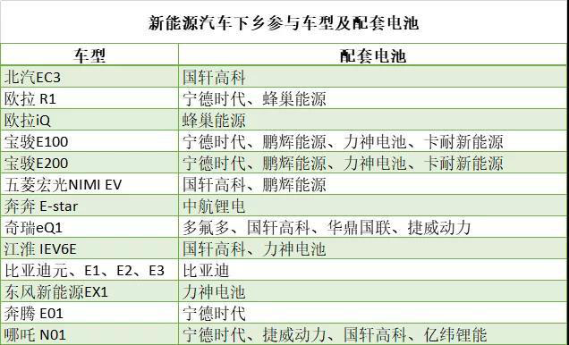 高工鋰電獲悉,參與上述16款車型的電池配套企業(yè)有11家,并集中在寧德時(shí)代、國(guó)軒、鵬輝、比亞迪、力神等電池企業(yè)。如寧德時(shí)代配套了歐拉R1、寶駿E100、寶駿E200、奔騰E01和哪吒N01等,國(guó)軒配套了北汽EC3、宏光Mini EV、奇瑞eQ1和哪吒N01等。