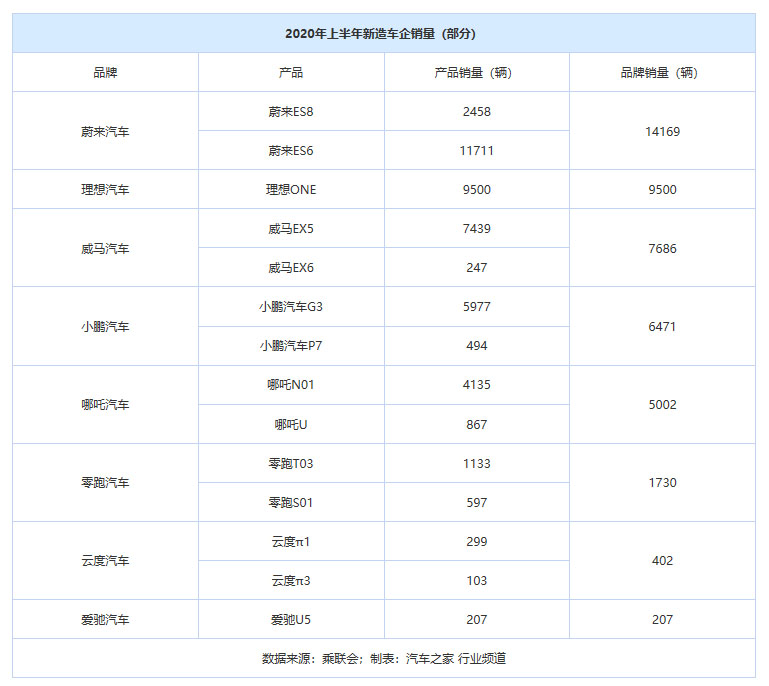上述幾家企業(yè)都是2020年上半年新勢力車企中銷量“尖子生”。根據(jù)乘聯(lián)會最新的統(tǒng)計數(shù)據(jù),2020年上半年,中國品牌造車新勢力銷量排名前五的品牌分別為蔚來汽車、理想汽車、威馬汽車、哪吒汽車和小鵬汽車,它們累計銷量為42828輛,占比中國品牌造車新勢力總銷量的91%、全國新能源總銷量的13.1%。造車新勢力在國內(nèi)新能源圈已占有一席之地,且兩級分化現(xiàn)象明顯。