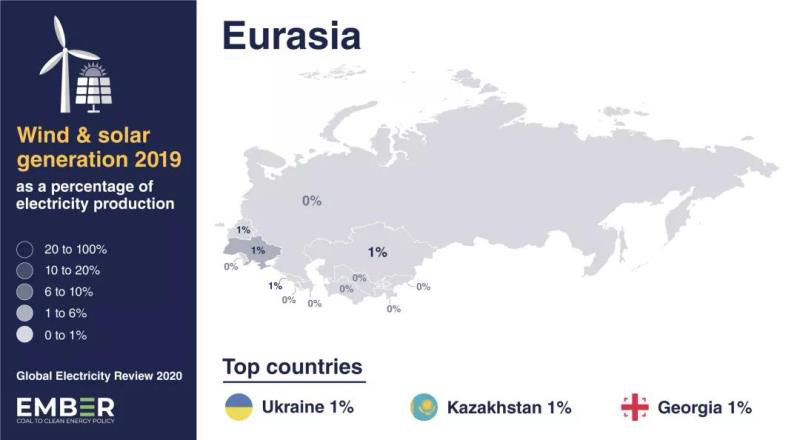 歐亞大陸顯然與世界其他地區(qū)格格不入。俄羅斯是世界上第四大電力需求國,風能和太陽能僅占其總量的0.1%。烏克蘭處于相對領(lǐng)先地位,并且在2019年發(fā)電量大增,建設(shè)了4GW的太陽能發(fā)電量,使其風能和太陽能發(fā)電機組的規(guī)模翻了一番,占比達到1%。