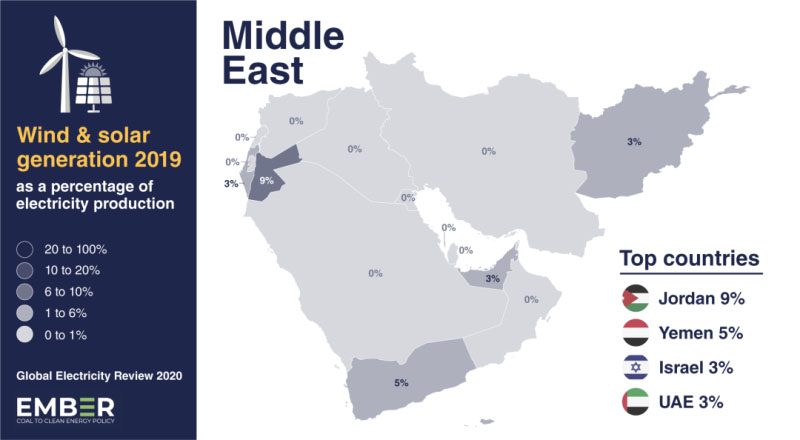 中東只有1%的電力來自風能和太陽能,遠遠落后于世界其他地區(qū)。主要國家是約旦(9%)、也門(5%)、以色列(3%)和阿拉伯聯(lián)合酋長國(3%);處于更落后狀態(tài)的國家包括伊朗(0.4%)、沙特阿拉伯(0.2%)和伊拉克(0.1%)。2019年,中東地區(qū)太陽能發(fā)電規(guī)模擴大,阿聯(lián)酋增加了1.3千兆瓦的太陽能發(fā)電量;沙特阿拉伯和以色列在2019年分別新增0.3和0.4吉瓦太陽能發(fā)電容量。