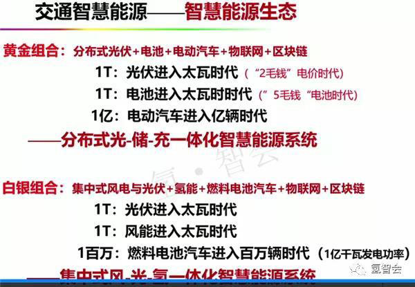 未來智慧能源生態(tài)將有兩個(gè)組合:一個(gè)是黃金組合——分布式光伏+電池+電動(dòng)汽車+物聯(lián)網(wǎng)+區(qū)塊鏈;光伏進(jìn)入2毛錢電價(jià),電池將會(huì)進(jìn)入5毛錢一瓦時(shí)的時(shí)代,電動(dòng)汽車進(jìn)入了億輛時(shí)代;還有一個(gè)是白銀組合,就是集中式風(fēng)電與光伏+氫能+燃料電池汽車+物聯(lián)網(wǎng)+區(qū)塊鏈。