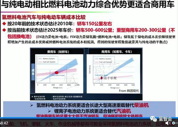所以基于可再生能源,純電動(dòng)和氫燃料電池優(yōu)勢(shì)凸顯。再看氫燃料電池和純電動(dòng)車輛成本比較:20年前剛開始搞電動(dòng)汽車專項(xiàng)時(shí),按照當(dāng)時(shí)的技術(shù)狀態(tài),估計(jì)2010年純電動(dòng)轎車只能跑150公里,150公里以上燃料電池就有優(yōu)勢(shì)。但是按照現(xiàn)在的狀態(tài)估計(jì)2025年車價(jià),純電動(dòng)轎車500-600公里內(nèi)都有成本優(yōu)勢(shì)。但是重型商用車,氫燃料電池300以上就有優(yōu)勢(shì)(這里不考慮換電重卡)。