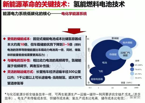 另外一個(gè)就是氫能燃料電池技術(shù),應(yīng)該也取得了一定程度的突破。根據(jù)儲(chǔ)能裝置的特性,目前的基本共識(shí)是:動(dòng)力電池是分布式、短周期儲(chǔ)能的最佳選擇;而長周期、大規(guī)模儲(chǔ)能要靠氫能;在車下固定式儲(chǔ)能,氫能的成本比電池儲(chǔ)電要低一個(gè)數(shù)量級(jí)(當(dāng)然車上不是這樣,車上沒地方放,只好高壓,成本就上去了),而且可以大規(guī)模、長周期儲(chǔ)能。另外儲(chǔ)氫和儲(chǔ)電互補(bǔ)。第三,運(yùn)儲(chǔ)方式也比較靈活,例如不一定要在新疆集中式可再生能源基地制氫,也可以在北京,對(duì)穩(wěn)定電網(wǎng)無論哪里都一樣??傊?,氫是集中式可再生能源大規(guī)模、長周期儲(chǔ)存的最佳途徑,一旦可再生能源成本降低,如果到0.1元一度電,儲(chǔ)存成本在總成本中間占的比例就最大,那時(shí)候它的優(yōu)勢(shì)就出來了,這是它存在的合理性。