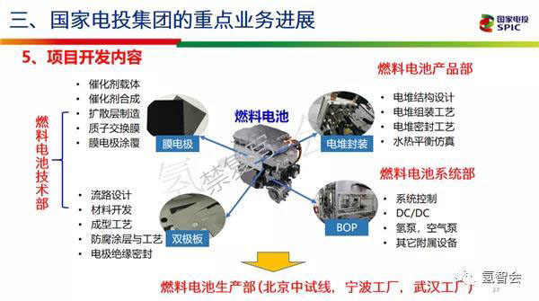 燃料電池里面如果把它分拆一下大概有十幾項(xiàng)關(guān)鍵技術(shù),我們包括催化劑載體到催化劑的合成,擴(kuò)散層制造到質(zhì)子交換膜、膜電極涂覆,還有雙極板,我們利用原來搞核電的一些材料加工技術(shù),包括流路設(shè)計(jì)、材料開發(fā)、成型、防腐涂層與工藝、電極絕緣密封,這個(gè)屬于燃料電池技術(shù)部。燃料電池產(chǎn)品部主要是電堆結(jié)構(gòu)設(shè)計(jì)、電堆組裝工藝、電堆密封工藝、水熱平衡仿真。燃料電池系統(tǒng)部,包括系統(tǒng)控制、DC/DC、氫泵、空氣泵、其它附屬設(shè)備。還有燃料電池生產(chǎn)部,主要北京中試線、寧波工廠、武漢工廠還有制氫儲氫部。