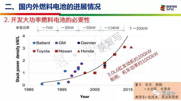 我們認(rèn)為開發(fā)大功率燃料電池的必要性。原來的燃料電池主要是功率密度低,造成整個(gè)成本比較高。而從95年到現(xiàn)在整個(gè)的功率大概是從最初的單堆7千瓦到后來Daimler出現(xiàn)114千瓦,整個(gè)增加了30倍左右。大功率的燃料電池為什么需要?因?yàn)槲覀冎乐乜?、機(jī)車、船舶功率需求都是300千瓦到1000千瓦以上,乘用車至少2.0升大概也需要100千瓦,如果100千瓦電堆做不出來的話,必須要靠鋰電池提速還是有一定的問題的。