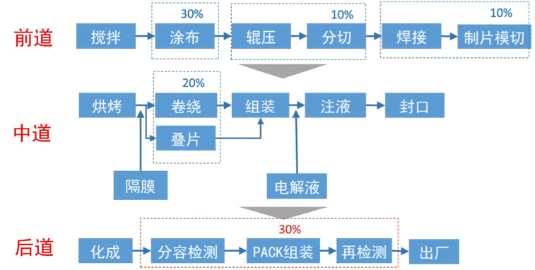 電芯的制造工序分為三段:極片制作(前段),電芯組裝(中段)、化成封測(后段)。