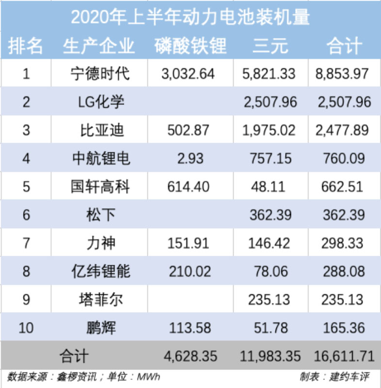 根據(jù)鑫欏資訊的數(shù)據(jù),2020年上半年動力電池裝機量為17.43 GWh,其中前10廠商的市場份額達到了驚人的95.3%。